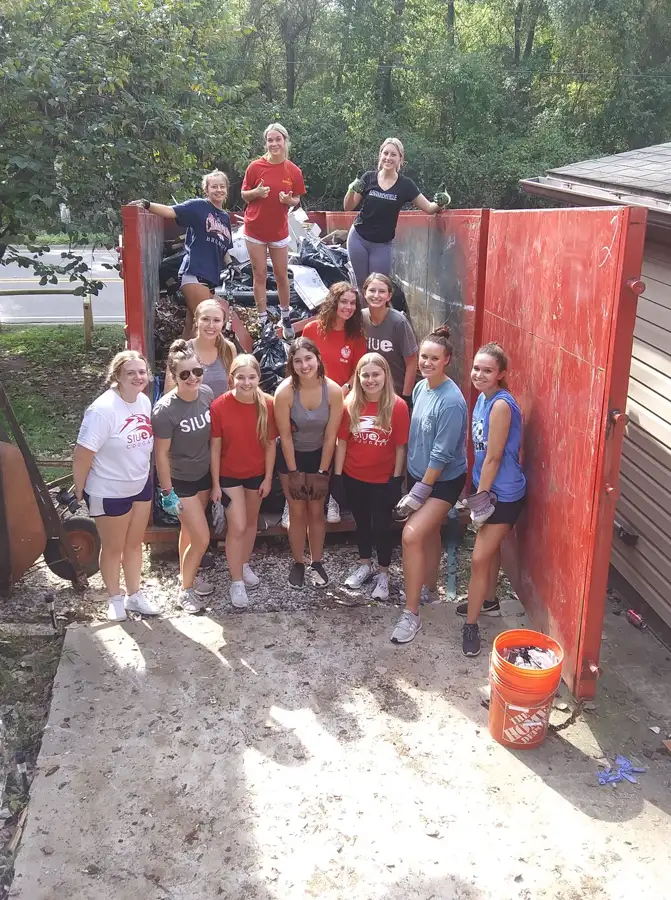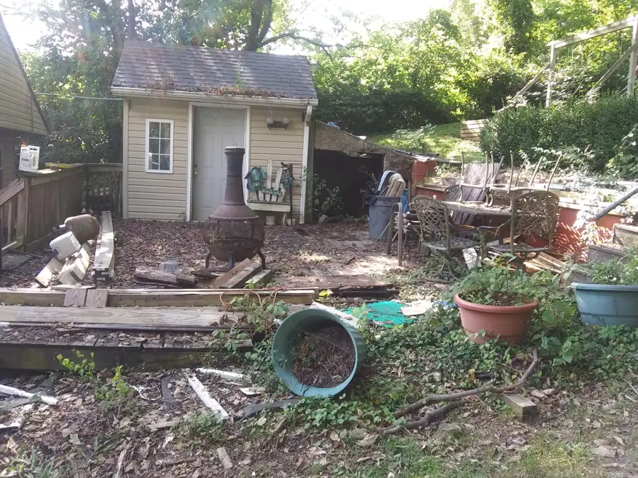 With the help of the Alpha XI Delta Sorority of SIUE, we got the first part of this project done this morning. Now we can see and replace the unsafe, rotten deck boards. Let me tell you, these young ladies were INCREDIBLE. Check out the amazing work they did cleaning up a senior, disabled woman’s yard. Girl Power.