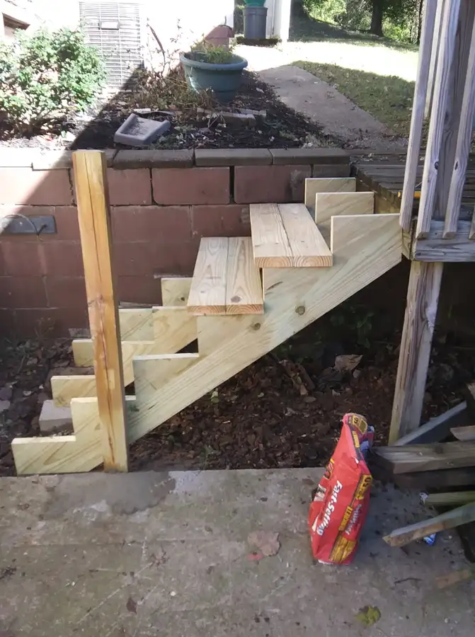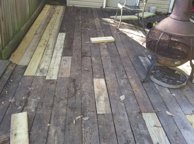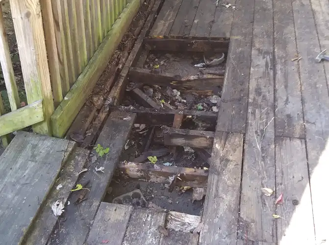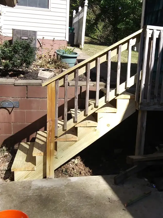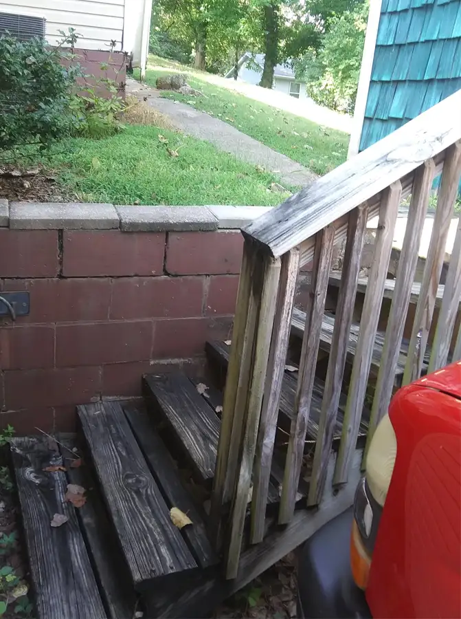 We were back today at the house that we cleaned up the yard a week or so ago. Now that we could see the rotten deck boards, we started replacing them. The problem that we ran into was that the infrastructure was rotten too, so we ended up rebuilding it in spots also. We tore out some old steps and rebuilt them today also. The homeowner is so happy.